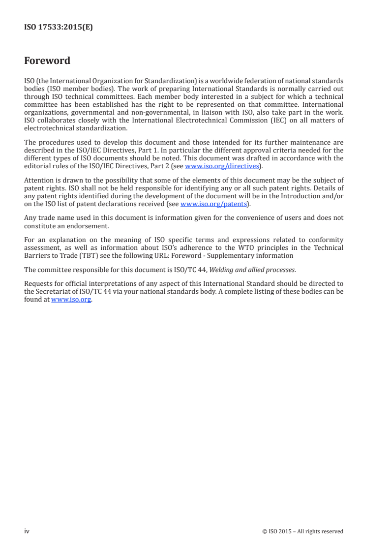ISO 17533:2015 is a standard published by the International Organization for Standardization (ISO). Its full title is "Welding for aerospace applications - Welding information in design documents". This standard covers: ISO 17533:2015 specifies appropriate welding/brazing design information on drawings serving to ensure fit, form and function of welded/brazed joints, and is applicable to welded and brazed metallic component parts used in aerospace construction.