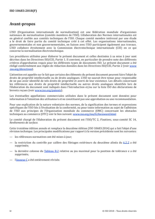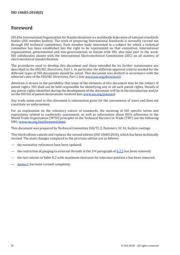 ISO 10683:2018 is a standard published by the International Organization for Standardization (ISO). Its full title is "Fasteners — Non-electrolytically applied zinc flake coating systems". This standard covers: This document specifies requirements for non-electrolytically applied zinc flake coating systems for steel fasteners. It is applicable to coatings: — with or without hexavalent chromium; — with or without top coat; — with or without lubricant (integral lubricant and/or subsequently added lubricant). It is applicable to bolts, screws, studs and nuts with ISO metric thread, to fasteners with non-ISO metric thread, and to non-threaded fasteners such as washers, pins, clips, etc. This document does not specify requirements for such fastener properties as weldability or paintability. It is not applicable to mechanically applied zinc coatings. NOTE Coatings in accordance with this document are especially used for high strength fasteners (≥ 1 000 MPa) to avoid risk of internal hydrogen embrittlement (IHE — see 4.4). Information for design and assembly of coated fasteners is given in Annex A.