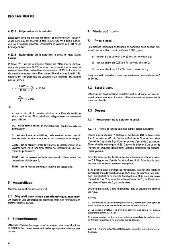 ISO 4947:1986 - Aciers et fontes -- Dosage du vanadium -- Méthode par titrage potentiométrique