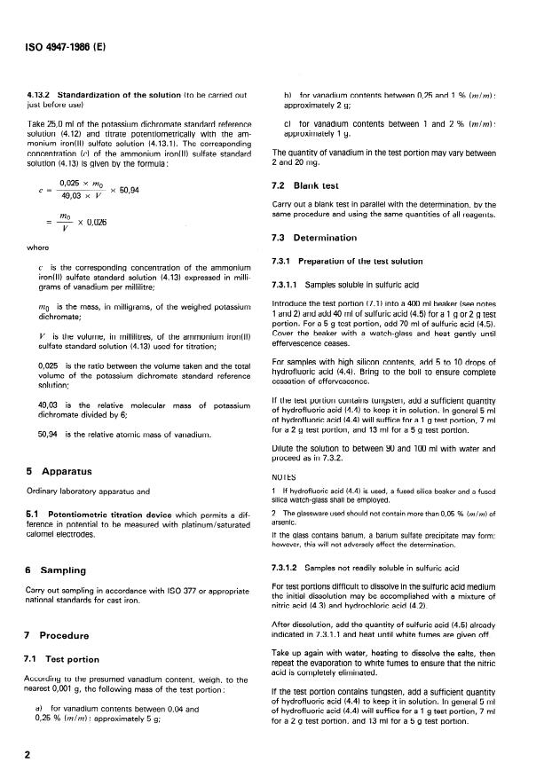 ISO 4947:1986 is a standard published by the International Organization for Standardization (ISO). Its full title is "Steel and cast iron — Determination of vanadium content — Potentiometric titration method". This standard covers: This method is applicable to vanadium contents between 0.04 % (m/m) and 2 % (m/m). Specifies principle, reagents, apparatus, sampling, procedure, expression of results and test report. Annex A gives additional information on the international co-operative tests. Annex B includes the graphical representation of precision data.