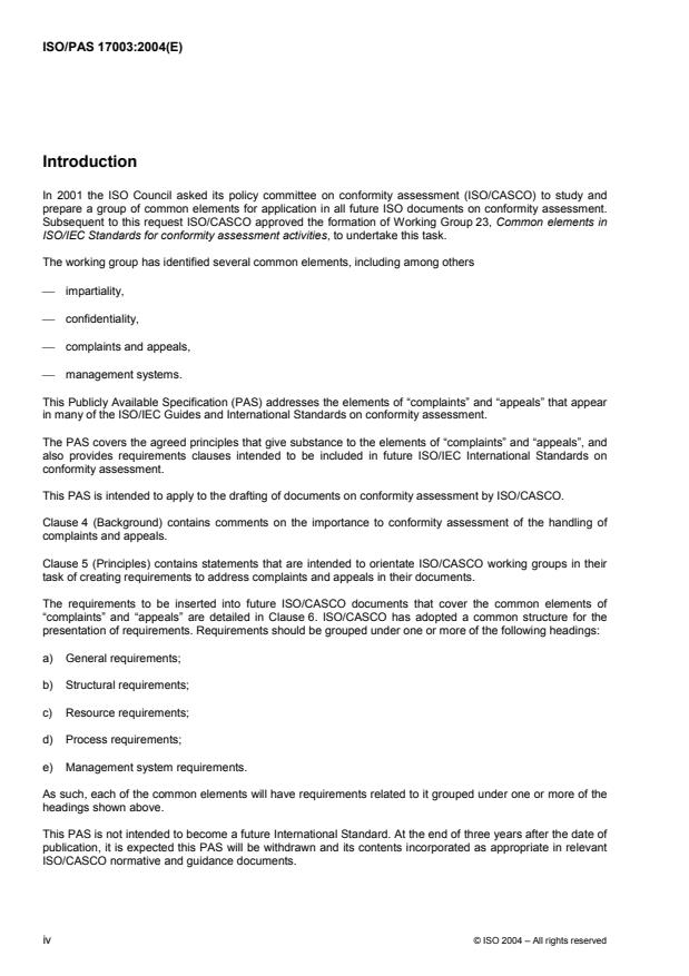 ISO/PAS 17003:2004 contains principles and requirements for the elements of complaints and appeals as they relate to conformity assessment. It is an internal tool for use in the ISO standards development process by ISO/CASCO working groups when addressing the elements of complaints and appeals in the preparation of their documents. ISO/PAS 17003:2004 is not a stand-alone normative document to be used directly in conformity assessment activities.