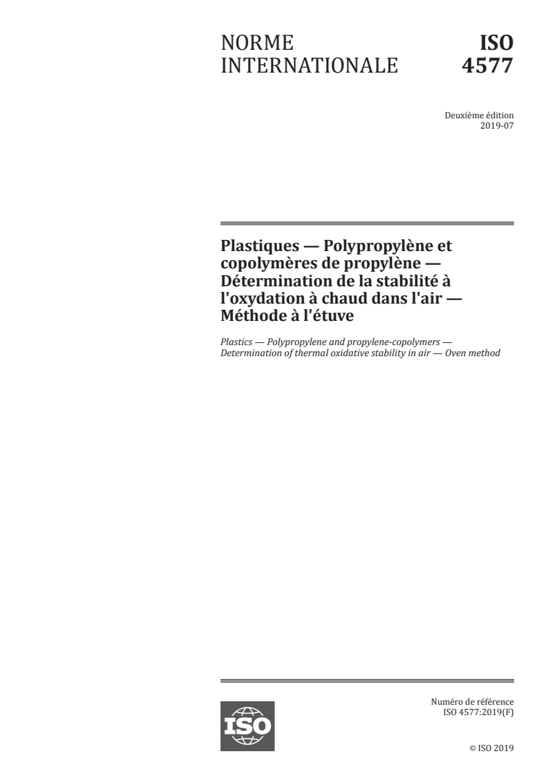 ISO 4577:2019 - Plastiques — Polypropylène et copolymères de propylène — Détermination de la stabilité à l'oxydation à chaud dans l'air — Méthode à l'étuve Released:7/17/2019
