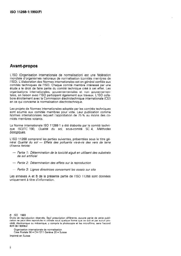 ISO 11268-1:1993 - Qualité du sol -- Effets des polluants vis-a-vis des vers de terre (Eisenia fetida)