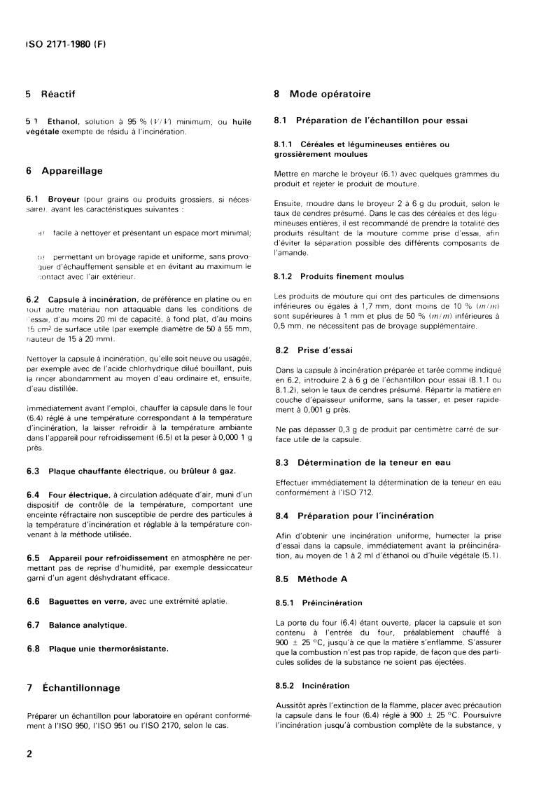 ISO 2171:1980 is a standard published by the International Organization for Standardization (ISO). Its full title is "Cereals, pulses and derived products — Determination of ash". This standard covers: Cereals, pulses and derived products — Determination of ash