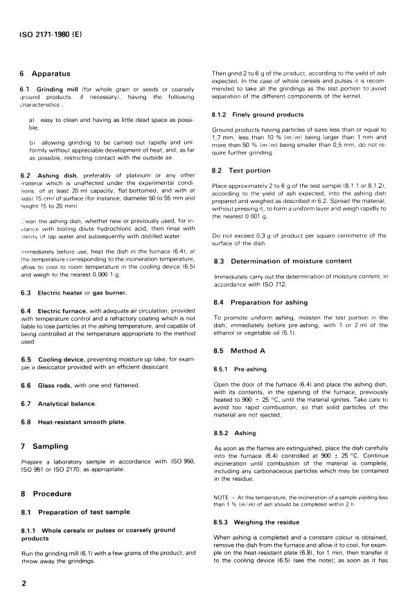 ISO 2171:1980 - Cereals, pulses and derived products — Determination of ash Released:5/1/1980