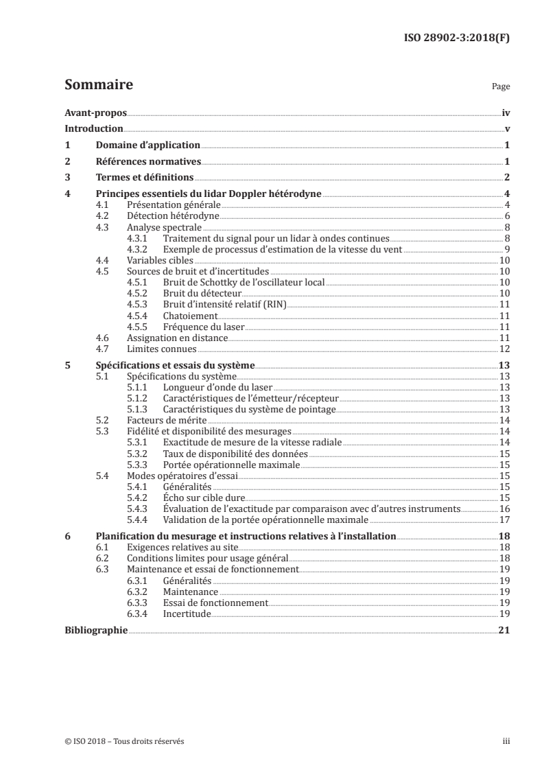 Le présent document spécifie les exigences et les modes opératoires d'essais de performance relatifs aux techniques de lidar Doppler monostatique hétérodyne à ondes continues et présente leurs avantages et limites. Dans le présent document, le terme «lidar Doppler» s'applique uniquement à des systèmes lidars monostatiques hétérodynes à ondes continues permettant d'extraire des mesures du vent à partir de la diffusion d'une lumière laser par des aérosols dans l'atmosphère. Les performances et les limites sont décrites sur la base de conditions atmosphériques normalisées. Le présent document décrit la détermination de la vitesse du vent sur la ligne de visée (vitesse radiale du vent). NOTE La détermination du vecteur vent à partir de mesures individuelles sur la ligne de visée n'est pas décrite dans le présent document car elle est hautement spécifique à une configuration de lidar particulière. Un exemple d'extraction du vecteur vent est donné dans l'ISO 28902-2:2017, Annexe B. Le présent document ne traite pas de l'extraction du vecteur vent. Le présent document peut être utilisé dans les champs d'application suivants: — points météorologiques, par exemple pour l'aviation, la sécurité aéroportuaire, les applications maritimes, les plates-formes pétrolières; — production d'énergie éolienne, par exemple évaluation d'un site, détermination de la courbe de puissance; — mesurages de routine des profils de vent dans les stations météorologiques; — surveillance de la dispersion des polluants dans l'atmosphère; — gestion des risques industriels (surveillance directe des données ou par assimilation des données dans des modèles de flux à micro-échelle); — processus d'échanges (émissions de gaz à effet de serre). Le présent document peut être utilisé par les fabricants de lidars Doppler monostatiques à ondes continues ainsi que par les organismes en charge des essais et de la certification de leur conformité. Le présent document fournit également des recommandations aux utilisateurs pour un usage adéquat de ces instruments.