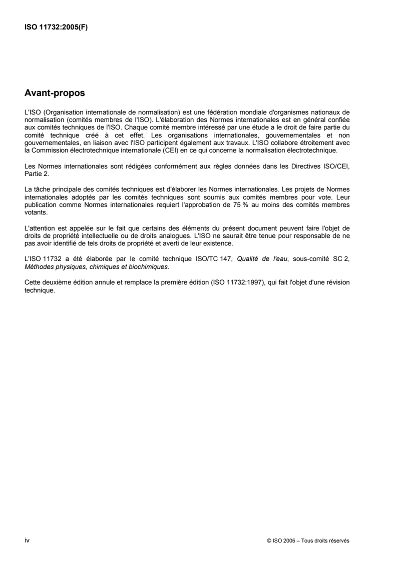 ISO 11732:2005 - Qualité de l'eau — Dosage de l'azote ammoniacal — Méthode par analyse en flux (CFA et FIA) et détection spectrométrique Released:2/4/2005