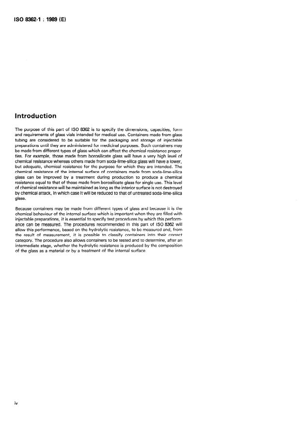 ISO 8362-1:1989 is a standard published by the International Organization for Standardization (ISO). Its full title is "Injection containers for injectables and accessories — Part 1: Injection vials made of glass tubing". This standard covers: Specification of form, dimensions, material, designations, performance and capacity of injection vails made of colourless or amber-coloured glass tubing which are used for packaging, storage or transport of products intended for injections.