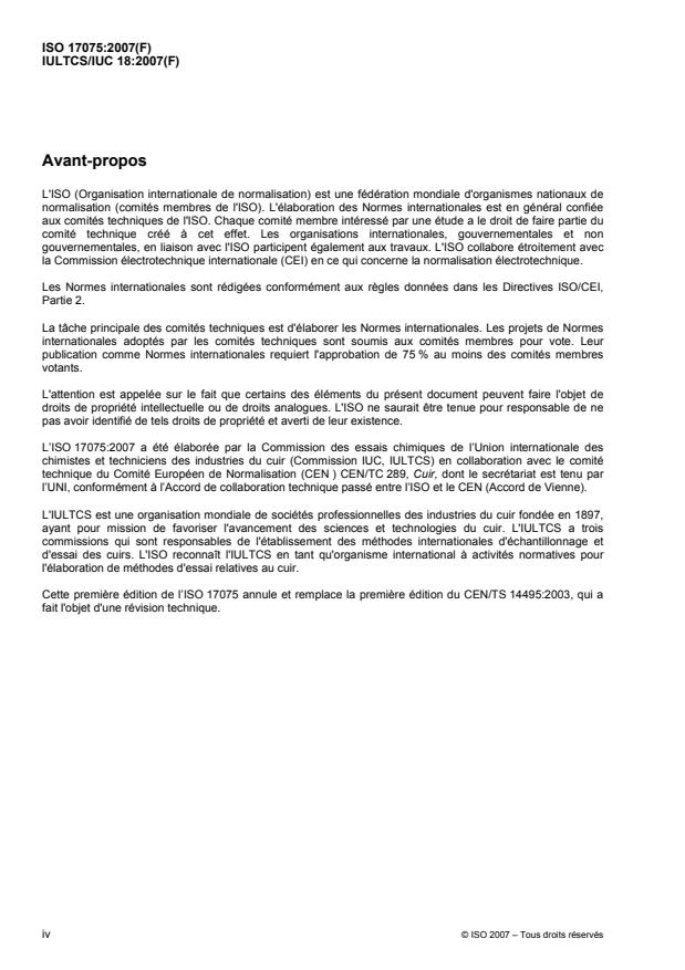 ISO 17075:2007 is a standard published by the International Organization for Standardization (ISO). Its full title is "Leather — Chemical tests — Determination of chromium(VI) content". This standard covers: ISO 17075:2007 specifies a method for determining chromium(VI) in solutions leached from leather under defined conditions. The method described is suitable to quantify the chromium(VI) content in leathers down to 3 mg/kg.