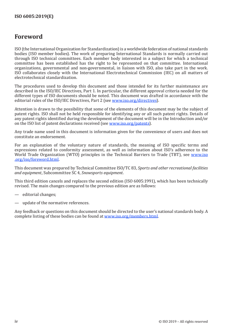 ISO 6005:2019 is a standard published by the International Organization for Standardization (ISO). Its full title is "Alpine skis - Ski binding screws - Test methods". This standard covers: This document specifies test methods for screws used for fastening ski bindings to alpine skis. NOTE 1 Acceptance criteria are specified in ISO 6004. The results of these test methods characterize the properties of the binding screw. NOTE 2 A test method for the mounting and fastening characteristics of different ski models is specified in ISO 8364.