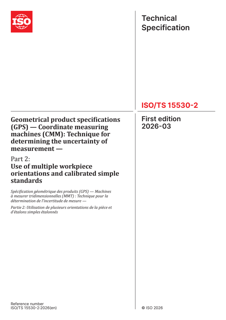 ISO/TS 15530-2:2026 - Geometrical product specifications (GPS) — Coordinate measuring machines (CMM): Technique for determining the uncertainty of measurement — Part 2: Use of multiple workpiece orientations and calibrated simple standards