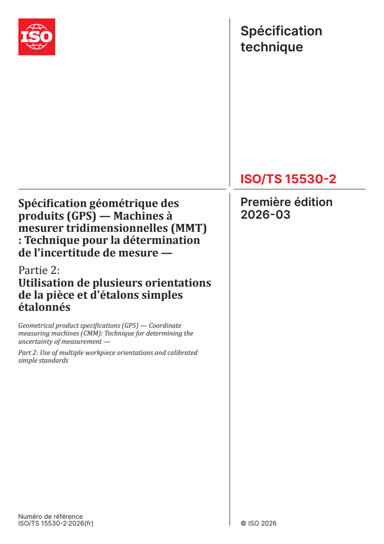 ISO/TS 15530-2:2026 - Spécification géométrique des produits (GPS) — Machines à mesurer tridimensionnelles (MMT) : Technique pour la détermination de l'incertitude de mesure — Partie 2: Utilisation de plusieurs orientations de la pièce et d'étalons simples étalonnés