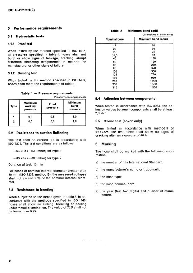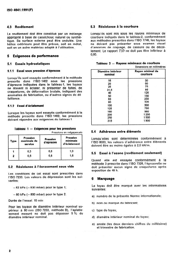 ISO 4641:1991 is a standard published by the International Organization for Standardization (ISO). Its full title is "Rubber hoses for water suction and discharge — Specification". This standard covers: La présente Norme internationale prescrit les exigences minimales pour les tuyaux en caoutchouc à armature textile, à paroi intérieure lisse, utilisés pour l'aspiration et le refoulement de l'eau. Deux types sont spécifiés, comme suit : -- Type 1 : «Tuyaux service léger», pour dépression de service de - 63 kPa (- 630 mbar) et pour pression de refoulement jusqu'à 0,3 MPa (3 bar). -- Type 2 : «Tuyaux service lourd», pour dépression de service de - 80 kPa (- 800 mbar) et pour pression de refoulement jusqu'à 0,5 MPa (5 bar).