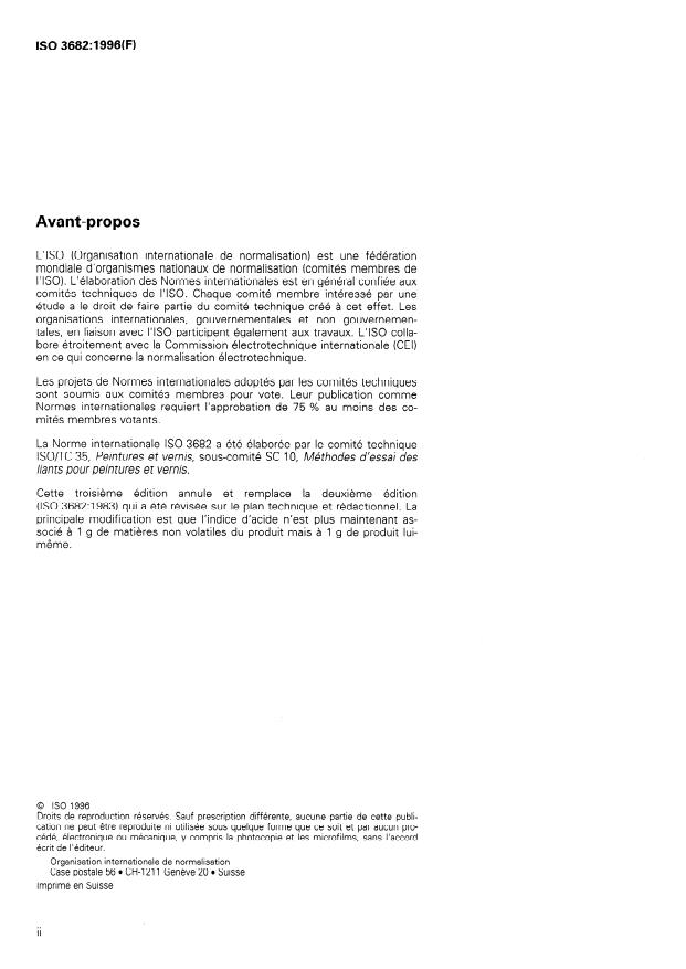ISO 3682:1996 is a standard published by the International Organization for Standardization (ISO). Its full title is "Binders for paints and varnishes — Determination of acid value — Titrimetric method". This standard covers: Binders for paints and varnishes — Determination of acid value — Titrimetric method