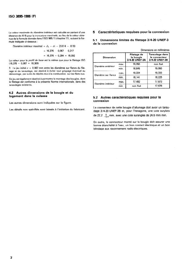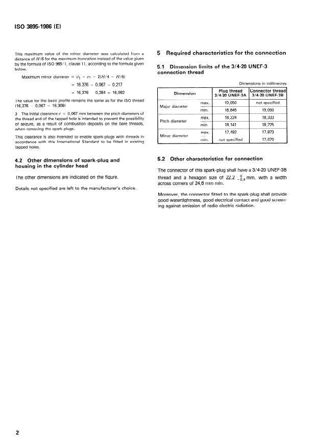 ISO 3895:1986 is a standard published by the International Organization for Standardization (ISO). Its full title is "Road vehicles - Screened and waterproof spark-plug and its connection - Type 2". This standard covers: Specifies the essential dimensional characteristics of a spark-plug type used with spark ignition engines. Tabulates major, pitch, and minor diameters for plug thread and connector thread. A figure illustrates shapes and reference quantities of concern. This third edition cancels and replaces the second edition (1979).