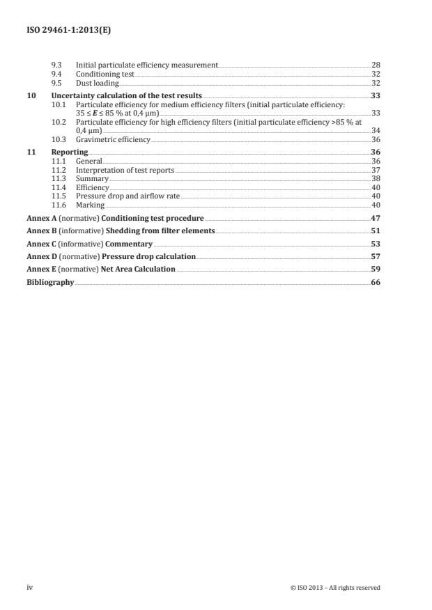 ISO 29461 specifies methods and procedures for determining the performance of particulate air filters used in air intake filter systems for rotary machinery such as stationary gas turbines, compressors and other stationary internal combustion engines. It applies to air filters having an initial particle efficiency up to 99,9 % with respect to 0,4 µm particles. Filters with higher initial particle efficiencies are tested and classified according to other standards (e.g. EN 1822). These procedures are intended for filters which operating at flow rates within the range 0,25 m3/s (900 m3/h) up to 1,67 m3/s (6000 m3/h). ISO 29461-1:2013 refers to static (barrier) filter systems but can be applied to other filter types and systems in appropriate circumstances. Two methods of determining the efficiency are used in ISO 29461-1:2013: particulate efficiency (measured with respect to particle number and size); gravimetric efficiency (percentage weighted mass removal of loading dust. Also a flat sheet media sample or media pack sample from an identical filter is conditioned (discharged) to provide information about the intensity of the electrostatic removal mechanism. After determination of its initial particle efficiency, the untreated filter is loaded with dust in steps until its final test pressure drop is reached. Information on the loaded performance of the filter is then obtained. The performance results obtained in accordance with ISO 29461-1:2013 cannot be quantitatively applied (by themselves) to predict performance in service with regard to efficiency and lifetime. Other factors influencing performance to be taken into account are described in the annexes.