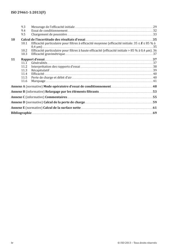 L'ISO 29461 spécifie les méthodes et modes opératoires pour la détermination de la performance des filtres à air utilisés dans les systèmes de filtration d'air d'admission pour machines tournantes, telles que les turbines à gaz, les compresseurs et les moteurs fixes à combustion interne. Elle s'applique aux filtres à air dont l'efficacité initiale va jusqu'à 99,9 % pour les particules de 0,4 µm. Les filtres avec une efficacité initiale supérieure sont soumis à essai et classés conformément à d'autres normes (par exemple l'EN 1822). Ce mode opératoire est prévu pour les filtres fonctionnant à des débits compris dans la plage de 0,25 m3/s (900 m3/h) à 1,67 m3/s (6 000 m3/h). L'ISO 29461-1:2013 concerne les systèmes de filtration (barrières filtrantes) statiques, mais peut aussi s'appliquer à d'autres types de filtres et systèmes de filtration, le cas échéant. Deux méthodes de détermination de l'efficacité sont utilisées dans l'ISO 29461-1:2013: l'efficacité particulaire (efficacité mesurée par rapport au nombre et à la taille des particules); l'efficacité gravimétrique (élimination en masse pondérée de la poussière de chargement). De plus, un échantillon de média plan ou un bloc d'échantillon de média, prélevé sur un filtre identique, doit être conditionné (déchargé) afin d'obtenir des informations sur l'intensité du mécanisme d'élimination électrostatique. Après détermination de son efficacité initiale, le filtre non traité est progressivement chargé de poussière jusqu'à atteindre sa perte de charge finale d'essai. Des informations sur les performances du filtre chargé sont ainsi obtenues. Les données de performance obtenues conformément à l'ISO 29461-1:2013 ne peuvent être utilisées quantitativement (par elles-mêmes) pour prédire les performances en service en termes d'efficacité et de durée de vie. Les autres facteurs ayant une incidence sur les performances à prendre en compte sont décrits dans les annexes.