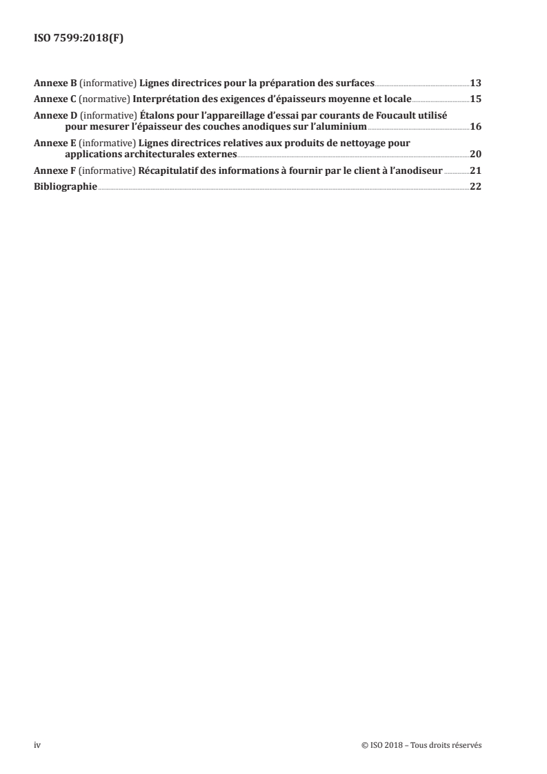 ISO 7599:2018 établit une méthode pour spécifier les couches anodiques décoratives et protectrices sur aluminium (y compris les alliages à base d'aluminium). Il définit les propriétés caractéristiques des couches anodiques, énumère les méthodes d'essai permettant de vérifier ces propriétés, fournit des exigences minimales de performance, renseigne sur les nuances d'aluminium aptes à l'anodisation et souligne l'importance du prétraitement dans l'obtention de l'aspect ou de l'état de surface requis de la pièce finie. ISO 7599:2018 n'est pas applicable: a) aux couches anodiques non poreuses du type couches-barrières; b) aux couches anodiques produites par anodisation à l'acide chromique ou à l'acide phosphorique; c) aux couches anodiques destinées principalement à servir de support à un autre revêtement organique ou électrolytique; et d) aux couches anodiques dures à usage industriel privilégiant les aspects de résistance à l'usure et à l'abrasion (voir l'ISO 10074).