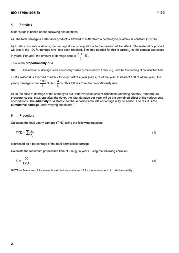 ISO 13760:1998 provides an empirically based method (Miner's rule) to calculate the cumulative damage that plastics pressure pipes can accumulate under varying internal pressures and temperatures over their service life. The standard is used to determine the maximum allowable hoop stress for a given temperature/pressure profile and expected lifetime. It emphasizes that Miner's rule is a first approximation and that each failure mechanism must be assessed separately (e.g., mechanical rupture vs. oxidative degradation).