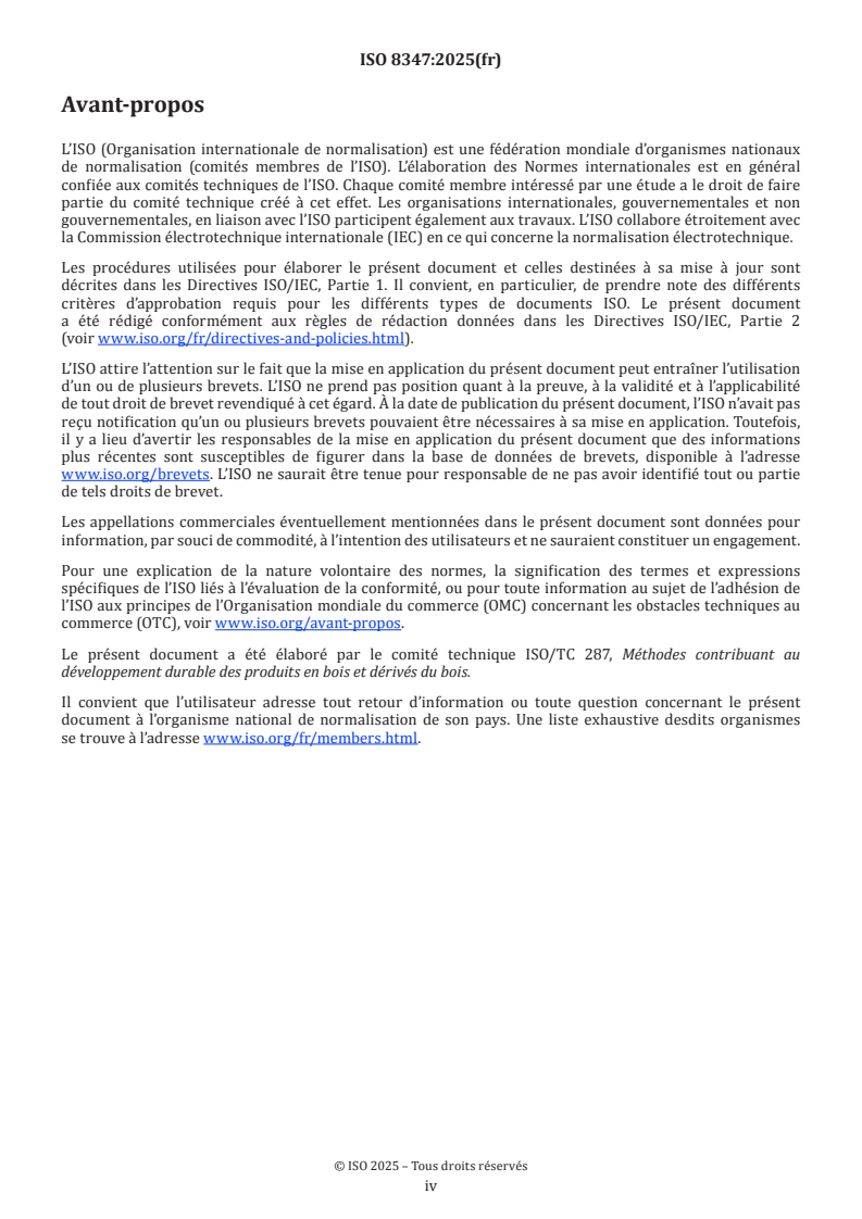 ISO 8347:2025 is a standard published by the International Organization for Standardization (ISO). Its full title is "Measurement procedures associated with the chain of custody in native tropical forest management areas". This standard covers: This document establishes a process to measure wood being logged in native tropical forest management areas following an approved and documented plan. Such a process includes quantifying and monitoring the harvested area to support the chain of custody assessment, helping to ensure the origin of the logged wood. Wood volume measurement is outside the scope of this document. This document proposes indicators that can be used to reinforce the level of confidence with regards to the correct origin of the logged wood, particularly when assessing the transport and commercial documentation of wood-based products, by means of a consistency check with what can be observed as occurring in the forest area declared as the origin of native tropical timber. The indicators will serve as an alert of any eventual inconsistency detected. These indicators are obtained by means of standardized metrics. These metrics are mathematical models that establish a correlation between the area of subtracted vegetation – detected through remote sensing monitoring tools – and the number of extracted trees that generate the amount of declared logged wood. This document is intended to be used to quantify the impact resulting from native vegetation extraction by selective logging in various tropical forest regions of the world, in order to support the long-term maintenance of these forest assets. The scope of this document is limited to native tropical forests, i.e. forests naturally originated and formed by native species (or group) in tropical regions. This document does not apply to planted forests, regardless of the species (or group) being native or exotic, as those forests are subject to varied and particular management practices which depend on the geographical conditions and rules of the country in which they are located. Regarding the limitations of this document, it is not intended to ensure: exact origin (geographical coordinates) of each log; exact volumes of wood extracted from the forest; species (or group) of wood harvested; chain of custody compliance; social and labour compliance of the audited operation; tax compliance of the audited operation. This document does not focus on, and is not oriented towards, biomass and carbon-balance estimations. This document does not cover any aspects of sustainable forest management and focuses on measurement procedures described above. In addition, it is not intended to be a Management Systems Standard (MSS). Furthermore, the national legal requirements and international policies are not repeated in this document, including those related to sustainability aspects, as well as those related to traditional and indigenous communities contained in the principles/articles of the UN Declaration on the rights of Indigenous Peoples (UNDRIP).