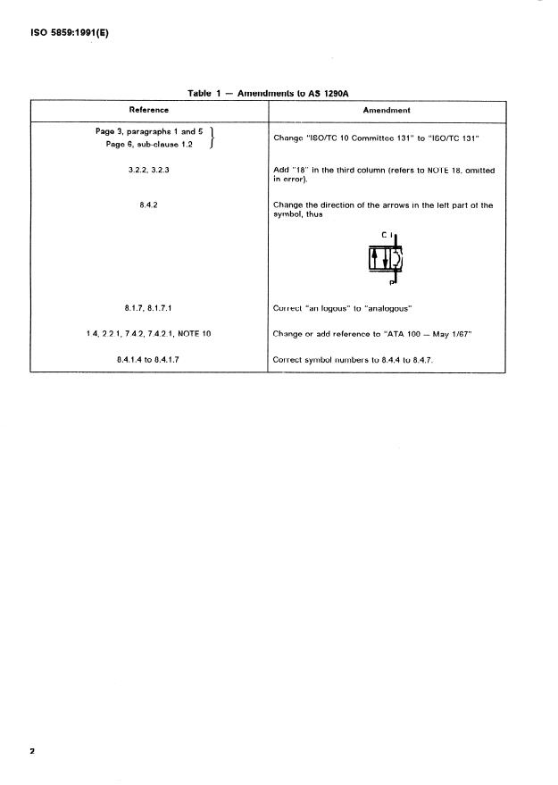 ISO 5859:1991 is a standard published by the International Organization for Standardization (ISO). Its full title is "Aerospace — Graphic symbols for schematic drawings of hydraulic and pneumatic systems and components". This standard covers: The requirements for the symbols are specified in SAE AS 1290A which is adopted as a de facto ISO International Standard. For the purposes of international standardization, the amendments listed in table 1 shall apply to the specific clauses of AS 1290A noted under "Reference".