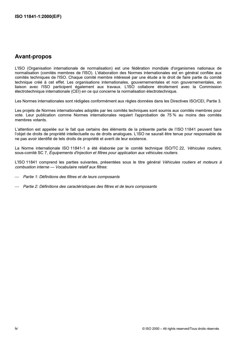 This part of ISO 11841 defines terms for filters and components used in road vehicles and internal combustion engines for general use (e.g. marine engines, stationary engines). The purpose of ISO 11841 is to standardize definitions, to facilitate their understanding, and to create the basis of a uniform translation into foreign languages. It is also recommended that this International Standard be used when establishing other technical documents.