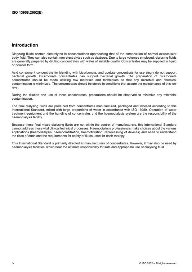 This International Standard is applicable to dry and liquid concentrates to be diluted for use as dialysing fluids in haemodialysis or haemodiafiltration. It addresses chemical quality and purity, microbial contamination, handling, measurement and labelling of concentrates, the requirements for containers and the tests to monitor concentrates. This International Standard does not address the final mixing and use of these concentrates and treated water in such therapies. That operation is the sole responsibility of dialysis professionals. This International Standard is not applicable to dialysing-fluid regeneration systems.