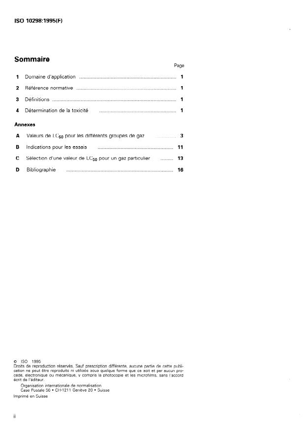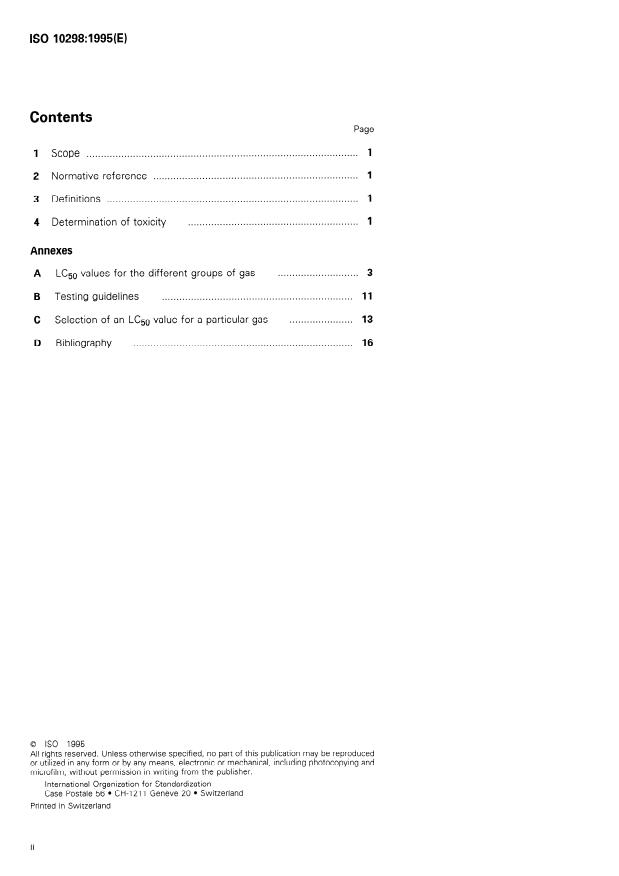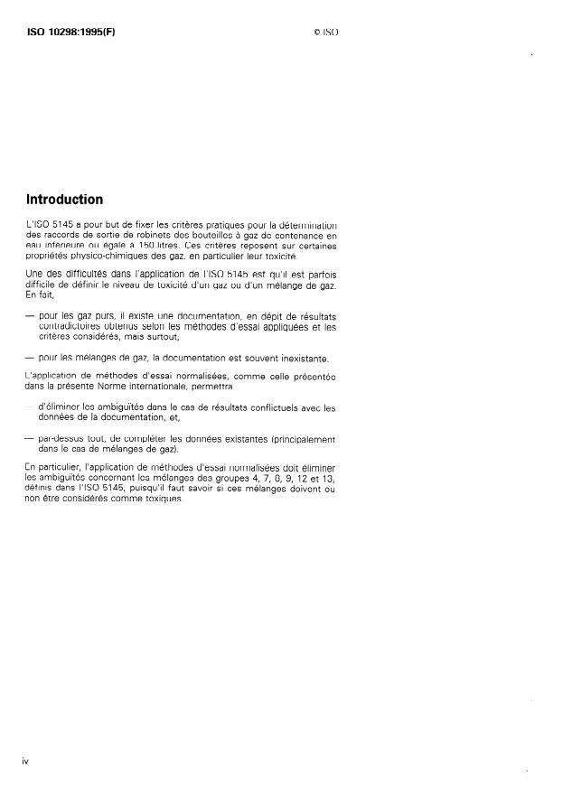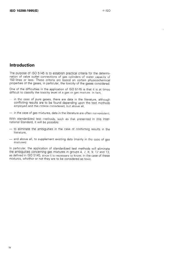 ISO 10298:1995 is a standard published by the International Organization for Standardization (ISO). Its full title is "Determination of toxicity of a gas or gas mixture". This standard covers: Describes a test method for the determination of the toxicity of a gas or gas mixture in order to eliminate difficulties involved in the application of ISO 5145. A calculation method enables the toxicity of gas mixtures to be determined in the absence of valid experimental data.