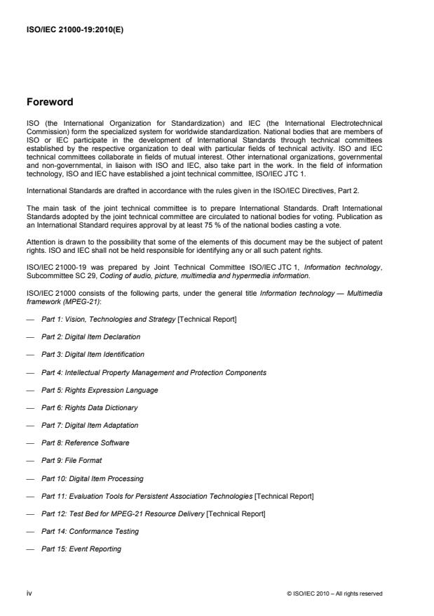 - Interoperability conventions: Documentation and namespace prefix conventions, and relation to other parts of ISO/IEC 21000 (e.g., Rights Expression Language, Digital Item Declaration).