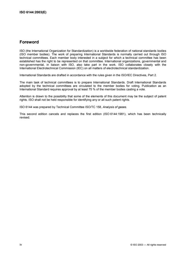 ISO 6144:2003 is a standard published by the International Organization for Standardization (ISO). Its full title is "Gas analysis - Preparation of calibration gas mixtures - Static volumetric method". This standard covers: ISO 6144:2003 specifies a method for the preparation of calibration gas mixtures by a static volumetric method and provides a procedure for calculating the volumetric composition of the mixture. It can be used either with binary gas mixtures (containing one calibration component in a complementary gas, which is usually nitrogen or air) or with mixtures containing more than one component in the complementary gas. This International Standard also specifies how the expanded uncertainty in the volume fraction of each calibration component in the mixture is determined by a rigorous evaluation of all the measurement uncertainties involved, including those associated with the apparatus used for the preparation of the gas mixture and those associated with the experimental procedure itself.