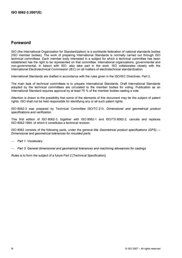 ISO 8062-3:2007 is a standard published by the International Organization for Standardization (ISO). Its full title is "Geometrical product specifications (GPS) — Dimensional and geometrical tolerances for moulded parts — Part 3: General dimensional and geometrical tolerances and machining allowances for castings". This standard covers: ISO 8062-3:2007 specifies general dimensional and geometrical tolerances, as well as machining allowance grades, for castings as delivered to the purchaser in accordance with ISO 8062-2. It is applicable for the tolerancing of dimensions and geometry, and required machining allowance of castings in all cast metals and their alloys produced by various casting manufacturing processes. ISO 8062-3:2007 applies to both general dimensional and general geometrical tolerances, unless otherwise specified. The dimensional tolerances covered by ISO 8062-3:2007 are tolerances for linear dimensions. The geometrical tolerances covered by ISO 8062-3:2007 are: tolerances for straightness, flatness, roundness, parallelism, perpendicularity, symmetry, and coaxiality. ISO 8062-3:2007 can be used for the selection of tolerance values for individual indications.