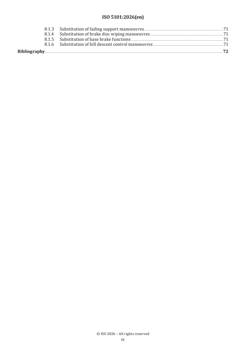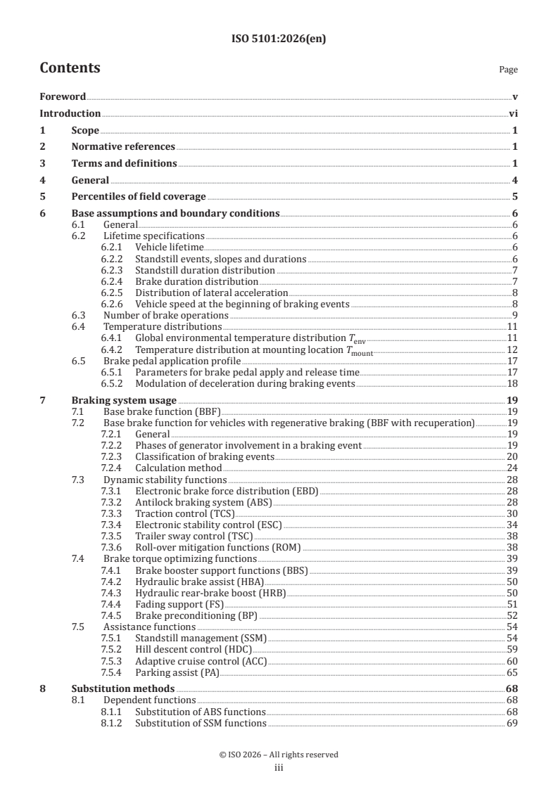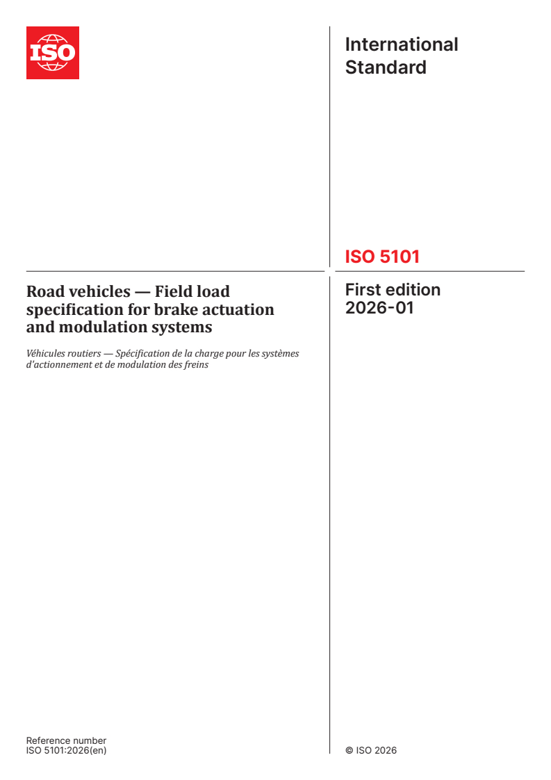 ISO 5101:2026 is a standard published by the International Organization for Standardization (ISO). Its full title is "Road vehicles — Field load specification for brake actuation and modulation systems". This standard covers: This document specifies expected field loads for functions provided by the braking system actuator and modulator and applies to passenger cars and light commercial vehicles (classes M1 and N1, according to UNECE). Functions addressed in this document are: — dynamic stability functions (e.g. electronic stability control); — brake torque optimizing functions (e.g. electronic brake force distribution); — brake assistance functions (e.g. hill start assist). This document only covers functions where data of appropriate maturity are available. There are additional functions of a braking system, which are not covered by this document. By describing the expected field loads, this document specifies representative manoeuvres and occurrences for different functions. These serve as an orientation for the derivation of test procedures. This document applies to vehicles up to conditional automation (SAE J 3016 level 3). NOTE Field loads for automation levels above level 3 are under consideration for future editions.
