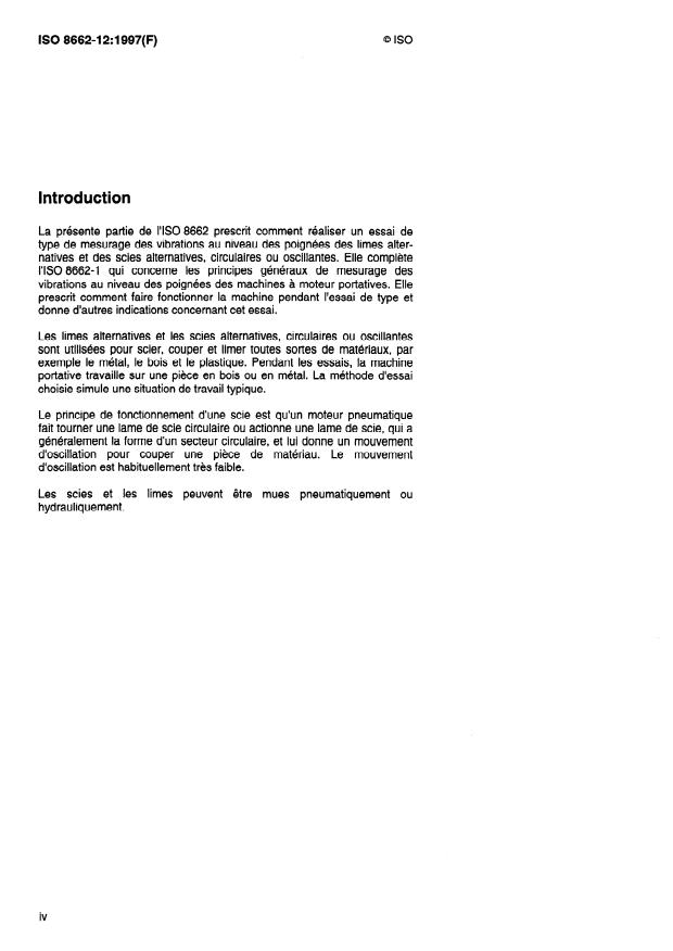 ISO 8662-12:1997 is a standard published by the International Organization for Standardization (ISO). Its full title is "Hand-held portable power tools — Measurement of vibrations at the handle — Part 12: Saws and files with reciprocating action and saws with oscillating or rotating action". This standard covers: Hand-held portable power tools — Measurement of vibrations at the handle — Part 12: Saws and files with reciprocating action and saws with oscillating or rotating action