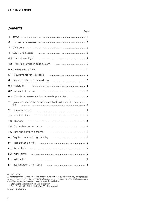 ISO 10602:1995 is a standard published by the International Organization for Standardization (ISO). Its full title is "Photography — Processed silver-gelatin type black-and-white film — Specifications for stability". This standard covers: Establishes the specifications for photographic films intended for the storage of records. Applies specifically to films with a base of safety cellulose ester or polyester Äpoly(ethylene terephthalate)Ü having silver-gelatin emulsions, processed to produce a black-and-white silver image by negative or full-reversal processing. The films that may have ultrasonic or dielectric (induction heated) splices are processed by a monobath which includes thiosulfate as the fixing agent followed by a conventional wash. Also applies to silver films given a stabilizing treatment by partial or full conversion to silver sulfide, silver selenide or gold.