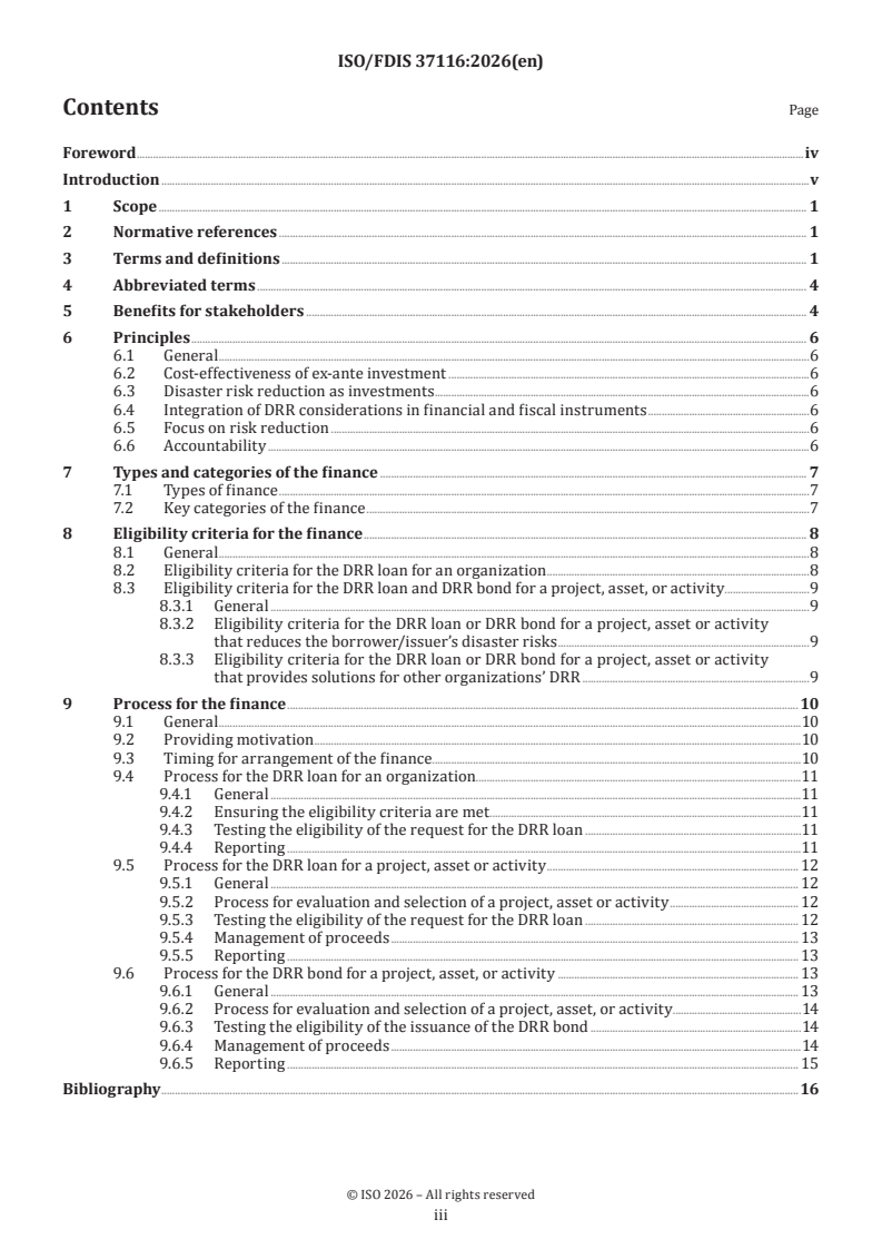 ISO/FDIS 37116 - Sustainable cities and communities — Disaster risk finance — Principles and general requirements for financing ex-ante investment in risk reduction Released:22. 01. 2026