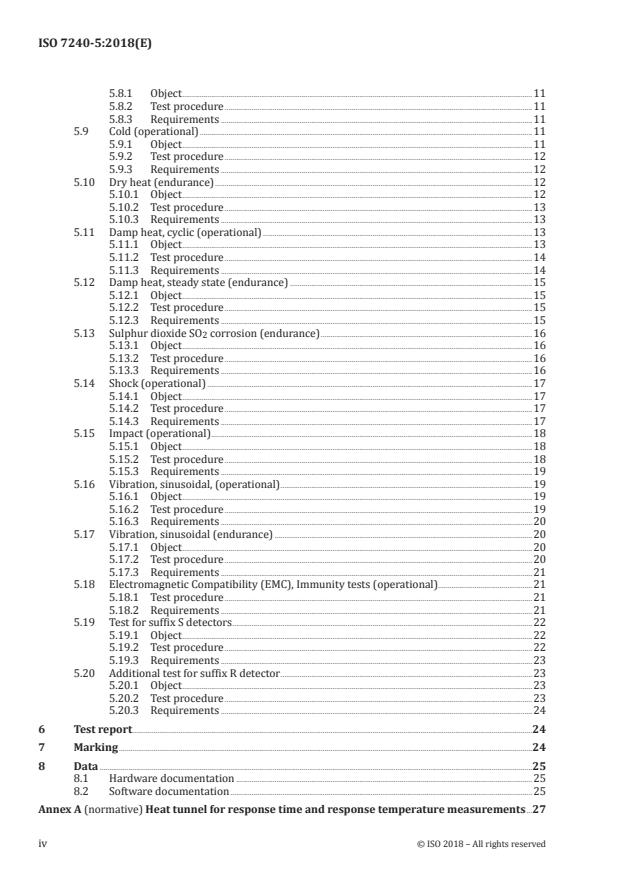 ISO 7240-5:2018 is a standard published by the International Organization for Standardization (ISO). Its full title is "Fire detection and fire alarm systems - Part 5: Point type heat detectors". This standard covers: ISO 7240-5:2018 specifies the requirements, test methods and performance criteria for point type heat detectors for use in fire detection and fire alarm systems for buildings (see ISO 7240‑1). For other types of heat detector, or for detectors intended for use in other environments, this document can be used for guidance only. Heat detectors with special characteristics and developed for specific risks are not covered by this document.