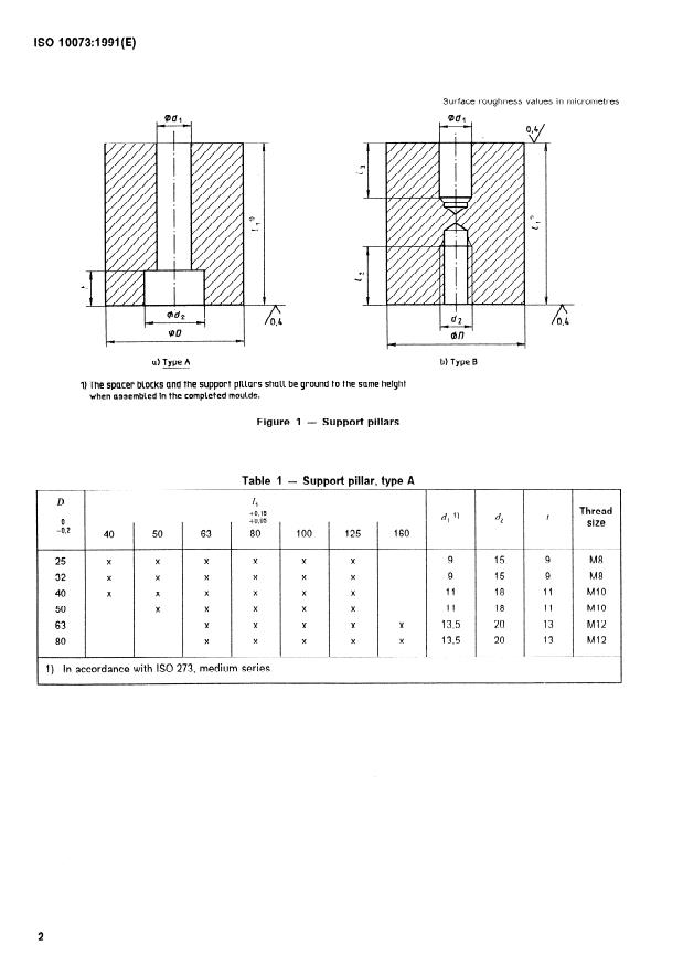 ISO 10073:1991 is a standard published by the International Organization for Standardization (ISO). Its full title is "Tools for moulding — Support pillars". This standard covers: Specifies the dimensions and tolerances. Gives examples of materials and hardness, but the choice shall be left to the manufacturer. Describes the designation to be used.