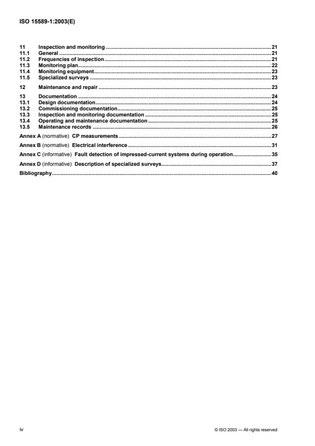 ISO 15589-1:2003 is a standard published by the International Organization for Standardization (ISO). Its full title is "Petroleum and natural gas industries — Cathodic protection of pipeline transportation systems — Part 1: On-land pipelines". This standard covers: ISO 15589-1:2003 specifies requirements and gives recommendations for the pre-installation surveys, design, materials, equipment, fabrication, installation, commissioning, operation, inspection and maintenance of cathodic protection systems for on-land pipelines, as defined in ISO 13623, for the petroleum and natural gas industries. ISO 15589-1:2003 is applicable to buried carbon steel and stainless steel pipelines on land. It can also apply to landfalls of offshore pipeline sections protected by onshore-based cathodic protection installations. ISO 15589-1:2003 is also applicable to retrofits, modifications and repairs made to existing pipeline systems. NOTE Special conditions sometimes exist where cathodic protection is ineffective or only partially effective. Such conditions can include elevated temperatures, disbonded coatings, thermal insulating coatings, shielding, bacterial attack and unusual contaminants in the electrolyte.