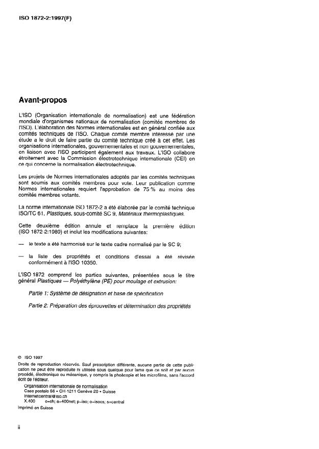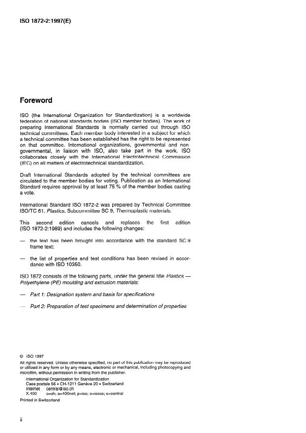 ISO 1872-2:1997 is a standard published by the International Organization for Standardization (ISO). Its full title is "Plastics — Polyethylene (PE) moulding and extrusion materials — Part 2: Preparation of test specimens and determination of properties". This standard covers: Plastics — Polyethylene (PE) moulding and extrusion materials — Part 2: Preparation of test specimens and determination of properties