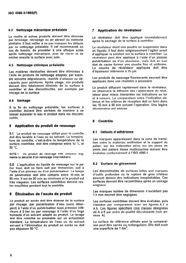 La présente partie de l'ISO 4386 prescrit une méthode de contrôle non destructif par ressuage des défauts d'adhérence et des discontinuités des surfaces de glissement des paliers. La méthode par ressuage est utilisée pour détecter a) les défauts d'adhérence dans la zone de transition entre le matériau antifriction et le support du palier, sur les collerettes et les plans de joint des paliers lisses multicouches lorsque ces défauts ne peuvent pas être détectés par la méthode aux ultrasons prescrite dans l'ISO 4386-1; b) les discontinuités des surfaces de glissement des paliers. Cette méthode est applicable, en principe, aux paliers lisses multicouches à l'état fini. Ce contrôle de la résistance de lien (adhérence) n'est possible que sur les paliers lisses moulés multicouches dont le support est en acier, en acier moulé ou en bronze moulé. La méthode n'est pas applicable aux supports difficiles ou impossibles à étamer, tels la fonte perlitique, l'acier inoxydable ou l'aluminium moulé car il n'y a pas d'adhérence possible entre le matériau antifriction et le matériau support.