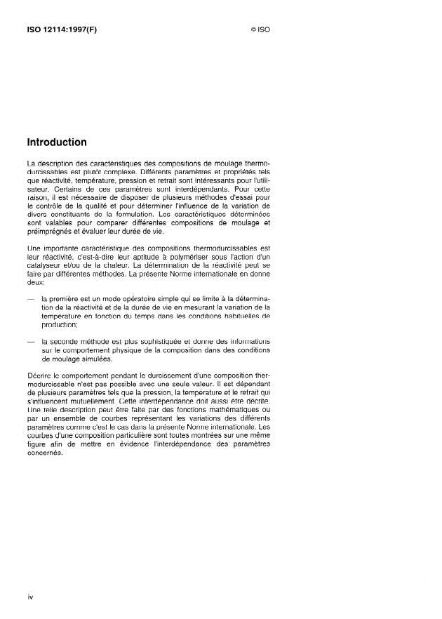 ISO 12114:1997 is a standard published by the International Organization for Standardization (ISO). Its full title is "Fibre-reinforced plastics - Thermosetting moulding compounds and prepregs - Determination of cure characteristics". This standard covers: La présente Norme internationale prescrit deux méthodes pour la détermination des caractéristiques de durcissement des compositions de moulage thermodurcissables renforcées de fibres et des préimprégnés. Les caractéristiques mesurées sont -- l'émission de chaleur due à l'exothermie de la réaction; -- la dilatation thermique du produit accompagnant l'augmentation de température; -- le retrait dû à la réaction de durcissement. Les méthodes sont applicables à toutes les compositions à base de matrices thermodurcissables renforcées de fibres. Le principal domaine d'application porte sur les produits à base de résines polyesters insaturés. La méthode I est une méthode d'essai permettant de déterminer la réactivité d'une composition thermodurcissable selon un mode opératoire simple. Cette mesure se rapporte uniquement au comportement réactif de la matrice et à son état de stabilisation (facteur influant sur la durée de vie de la composition de moulage). La méthode II est une méthode d'essai qui nécessite un équipement plus sophistiqué, prend plus de temps mais donne des indicatio 269ns détaillées supplémentaires sur le comportement physique de la composition dans des conditions de moulage habituelles simulées. Il en résulte une plaque qui pourra être utilisée ultérieurement pour déterminer certaines propriétés du produit moulé.