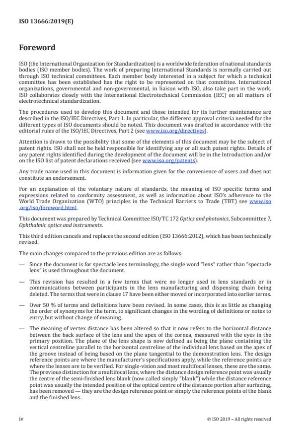 ISO 13666:2019 is a standard published by the International Organization for Standardization (ISO). Its full title is "Ophthalmic optics — Spectacle lenses — Vocabulary". This standard covers: This document defines terms relating to ophthalmic optics, specifically to blanks, finished spectacle lenses and fitting purposes. Terms relating to processes and material for fabrication and surface treatment (other than some specific terms relating to coatings), and terms relating to defects in materials and after optical processing are given in ISO 9802.