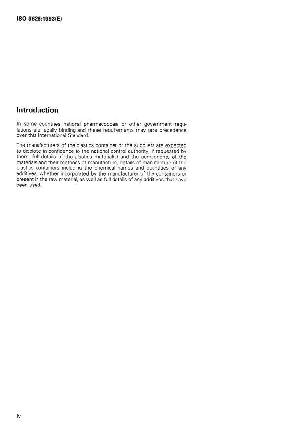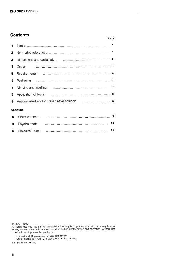 ISO 3826:1993 is a standard published by the International Organization for Standardization (ISO). Its full title is "Plastics collapsible containers for human blood and blood components". This standard covers: Specifies requirements, including performance requirements (dimensions, design, conditions of manufacture, sterilization, transparency, coloration, thermal stability, vapour transmission, resistance to distortion, resistance to leakage, chemical requirements, biological requirements, packaging, marking and labelling) for di-(2-ethylhexyl)phthalate plasticized polyvinyl chloride for complete plastics collapsible, non-vented, sterile containers.