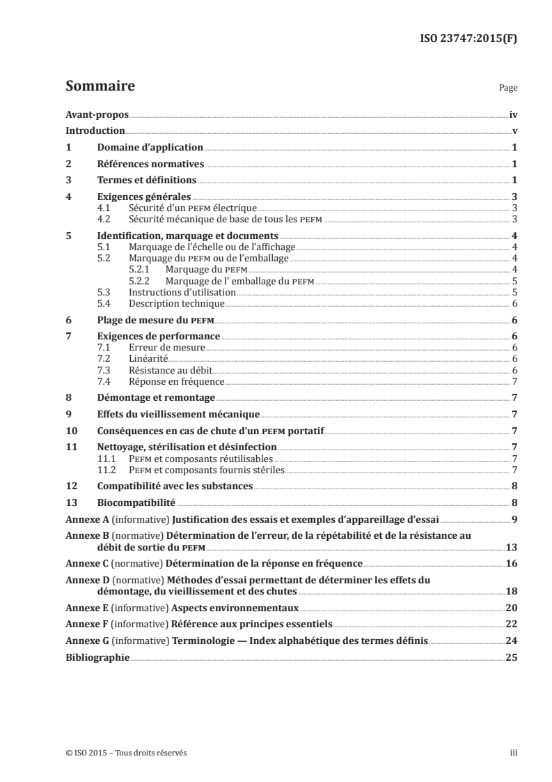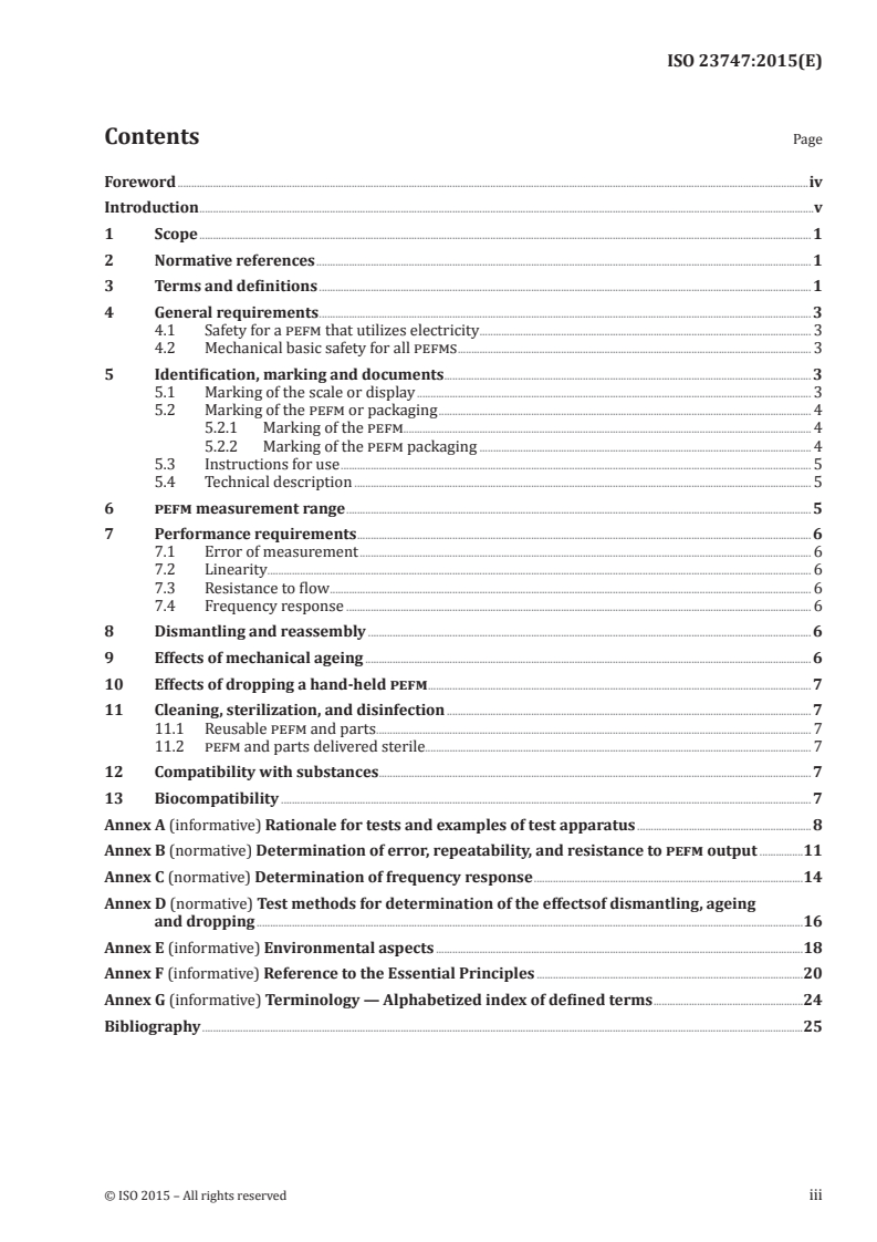 ISO 23747:2015 specifies requirements for a peak expiratory flow meter (pefm) intended for the assessment of pulmonary function in spontaneously breathing humans. ISO 23747:2015 covers all medical devices that measure peak expiratory flowrate in spontaneously breathing humans either as part of an integrated lung function medical device or as a stand-alone medical device. Planning and design of products applying to this International Standard are to consider the environmental impact from the product during its life cycle. Environmental aspects are addressed in Annex E. NOTE Additional aspects of environmental impact are addressed in ISO 14971.