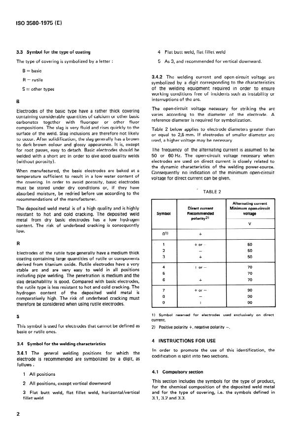 ISO 3580:1975 is a standard published by the International Organization for Standardization (ISO). Its full title is "Covered electrodes for manual arc welding of creep-resisting steels — Code of symbols for identification". This standard covers: Establishes a code for the identification of covered electrodes by means of symbols. The codification is divided into four parts: The first part symbolizes the type of product, the second part is a symbol for the chemical composition of the deposited weld metal, the third part is a symbol for the type of coating, and the fourth part is a symbol for the welding characteristics of the electrode.