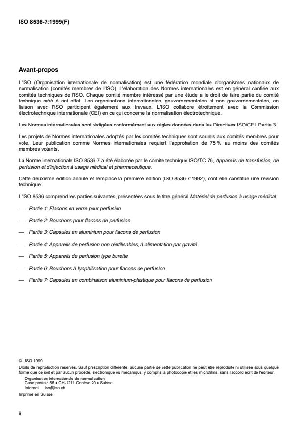 ISO 8536-7:1999 is a standard published by the International Organization for Standardization (ISO). Its full title is "Infusion equipment for medical use — Part 7: Caps made of aluminium-plastics combinations for infusion bottles". This standard covers: Infusion equipment for medical use — Part 7: Caps made of aluminium-plastics combinations for infusion bottles