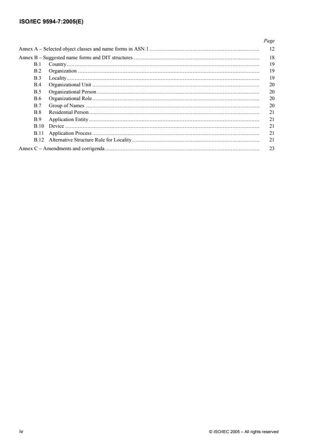 ISO/IEC 9594-7:2005 is a standard published by the International Organization for Standardization (ISO). Its full title is "Information technology — Open Systems Interconnection — The Directory: Selected object classes — Part 7:". This standard covers: ISO/IEC 9594-7:2005 provides specifications for how information about objects, e.g. persons, is organized, created, maintained and retrieved. It also gives provision for protecting stored information through authentication and access control specifications. ISO/IEC 9594-7:2005 defines a number of selected object classes and name forms which may be useful across a range of applications of the Directory. An object class definition specifies the attribute types which are relevant to the objects of that class. A name form definition specifies the attributes to be used in forming names for the objects of a given class.