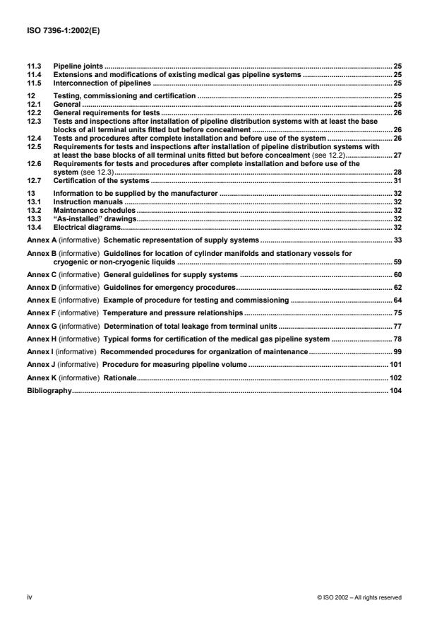 ISO 7396-1 specifies requirements for design, installation, function, performance, documentation, testing and commissioning of compressed medical gas and vacuum pipeline systems in health care facilities to ensure continuous delivery of the correct gas from the pipeline system. It includes requirements for supply systems, pipeline distribution systems, control systems, monitoring and alarm systems and non-interchangeability between components of different gas systems. ISO 7396-1 is applicable to pipeline systems for the following medical gases: oxygen; oxygen-enriched air; nitrous oxide; air for breathing; carbon dioxide; oxygen/nitrous oxide mixtures; air for driving surgical tools; nitrogen for driving surgical tools; and to vacuum pipeline systems. ISO 7396-1 is also applicable to pipeline distribution systems for oxygen-enriched air connected to supply systems with oxygen concentrators complying with ISO 10083. ISO 7396-1 also applies to extensions and modifications of existing pipeline systems. ISO 7396-1 is not applicable to provision for gas-specific connectors on mobile or stationary cryogenic vessels or on transport vehicles, or on the inlet/outlet of cylinders for non-cryogenic liquid or gas. ISO 7396-1 does not apply to medical gas pipeline systems supplying hyperbaric chambers.