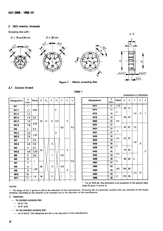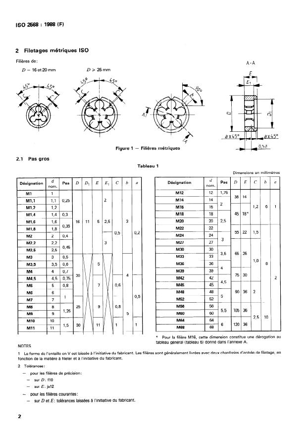 ISO 2568:1988 is a standard published by the International Organization for Standardization (ISO). Its full title is "Hand- and machine-operated circular screwing dies and hand-operated die stocks". This standard covers: La présente Norme internationale fixe les dimensions générales des filières à main et à machine. Ces dimensions, établies en fonction du diamètre et du pas de filetage, sont les suivantes: diamètre extérieur; épaisseur; longueur taillée; dimensions générales de fixation. Elle fixe également les dimensions d'interchangeabilité des porte-filières à main. La présente Norme internationale est applicable aux filières destinées à l'exécution des filetages suivants: Filetages métriques ISO: à pas gros, de M1 à M68; à pas fins, de M1 à M56. Filetages ISO en inches: série «Unified Coarse» (UNC), de N° 1 -- 64 à 2 3/4 -- 4; série «Unified Fine» (UNF), de N° 0 -- 80 à 1 1/2 -- 12. Les caractéristiques dimensionnelles des filières rondes, en fonction des diamètres et pas de filetage, sont données dans l'annexe A.