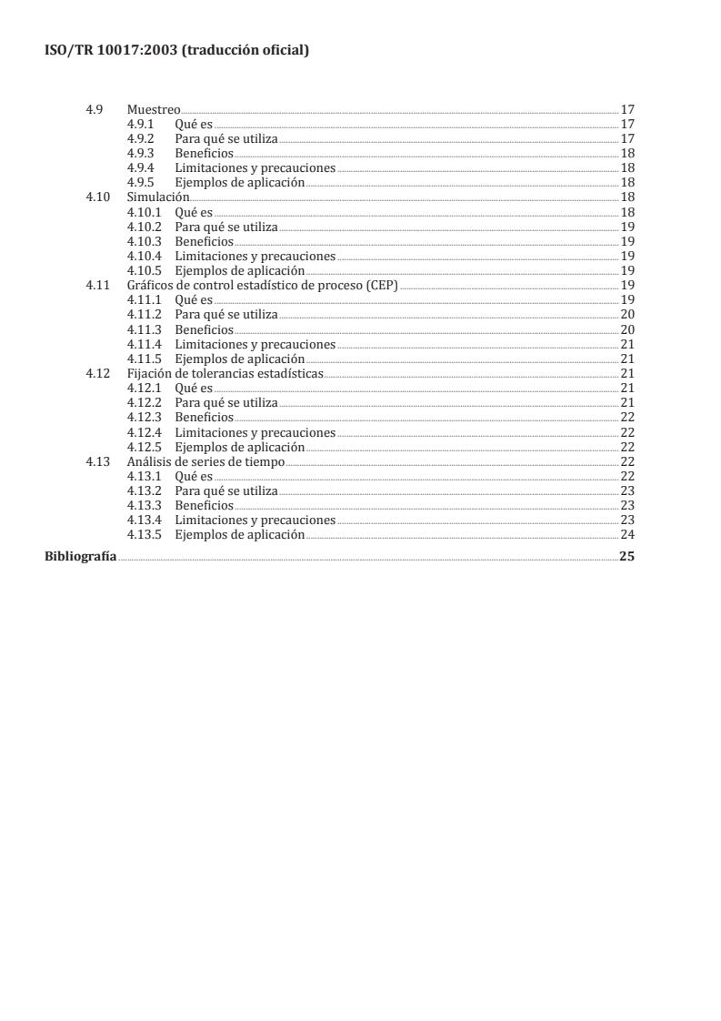 ISO/TR 10017:2003 provides guidance on the selection of appropriate statistical techniques that may be useful to an organization in developing, implementing, maintaining and improving a quality management system in compliance with ISO 9001. This is done by examining those requirements of ISO 9001 that involve the use of quantitative data, and then identifying and describing the statistical techniques that can be useful when applied to such data. The list of statistical techniques cited in ISO/TR 10017:2003 is neither complete nor exhaustive, and does not preclude the use of any other techniques (statistical or otherwise) that are deemed to be beneficial to the organization. Furthermore, ISO/TR 10017:2003 does not attempt to prescribe which statistical technique(s) are to be used; nor does it attempt to advise on how the technique(s) are to be implemented. ISO/TR 10017:2003 is not intended for contractual, regulatory or certification/registration purposes. It is not intended to be used as a mandatory checklist for compliance with ISO 9001:2000 requirements. The justification for using statistical techniques is that their application would help to improve the effectiveness of the quality management system.